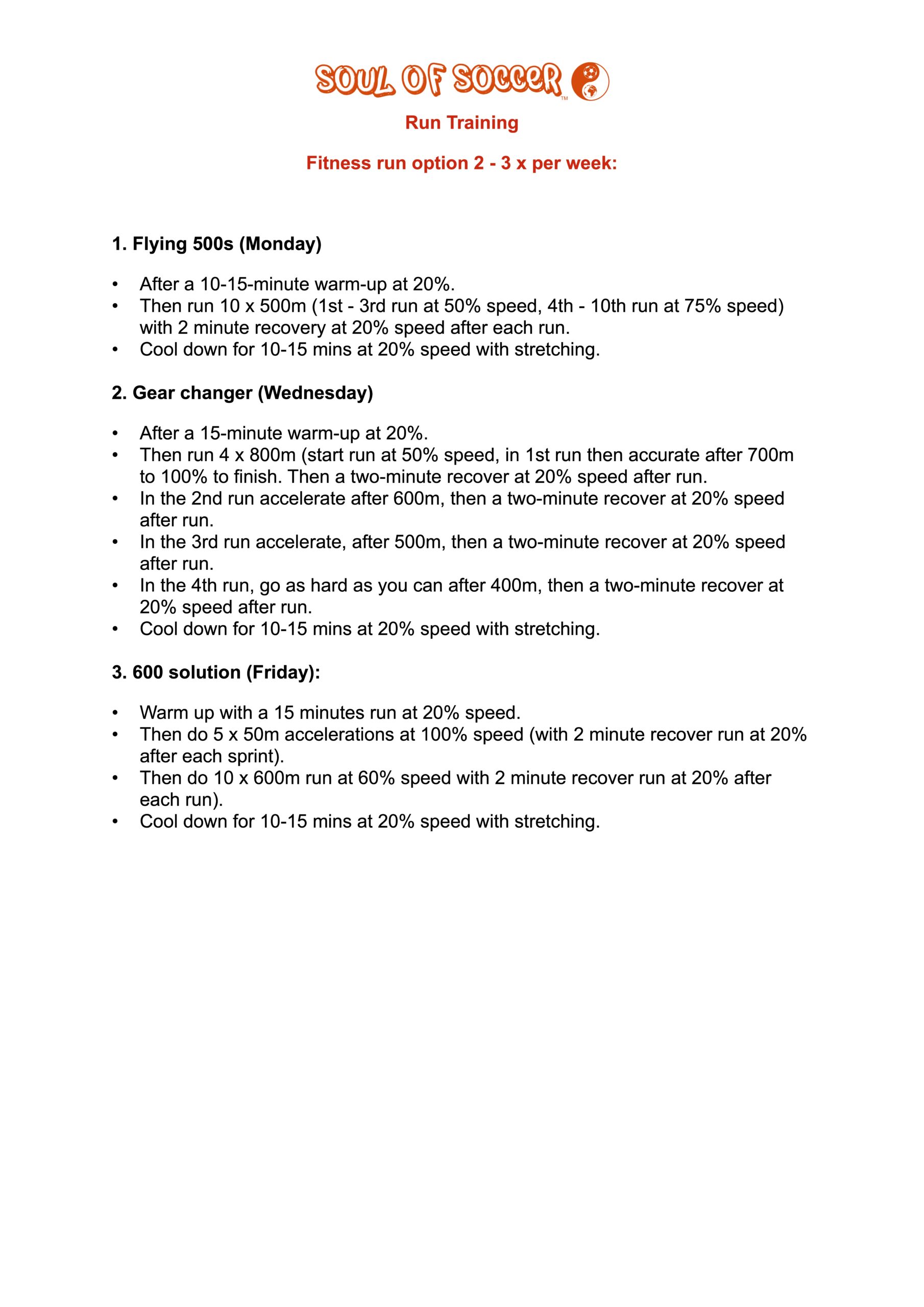- In the 3rd run accelerate, after 500m, then a two-minute recover at 20% speed after run.