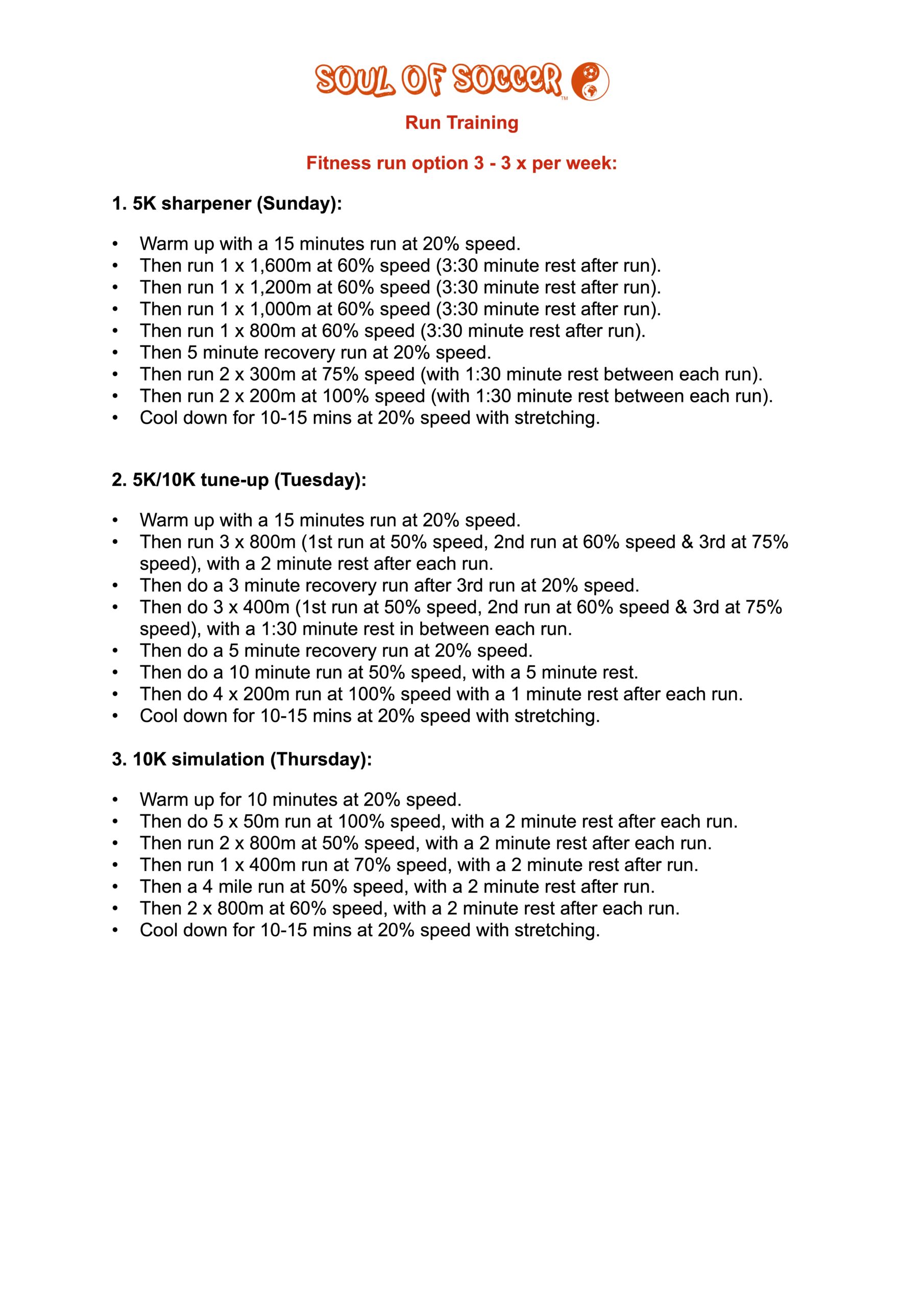 - Then run 3 x 800m (1st run at 50% speed, 2nd run at 60% speed & 3rd at 75% speed), with a 2 minute rest after each run.
